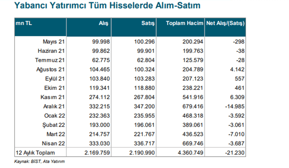 En son gelen Nisan 2022 verisine baktığımızda yabancı yatırımcıların Nisan ayında nette 3.687 m TL satış yaptığını gördük. Aslında aşağıdaki tabloda görüldüğü üzere son 5 aydır yabancı yatırımcıların nette satış tarafında olduğunu görmekteyiz.